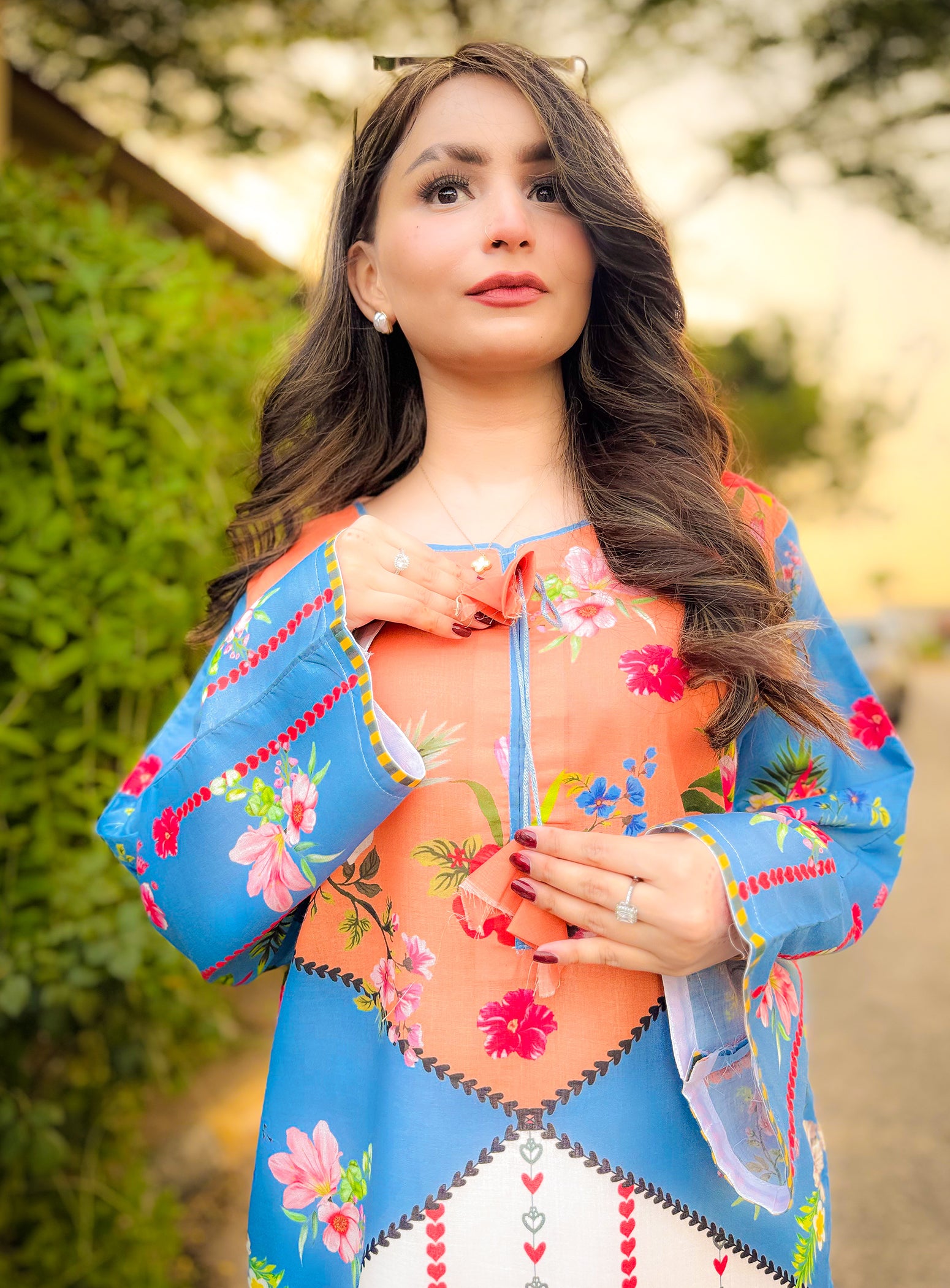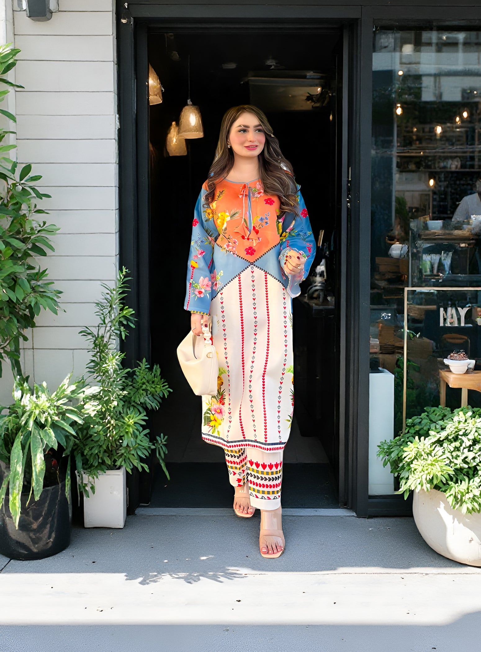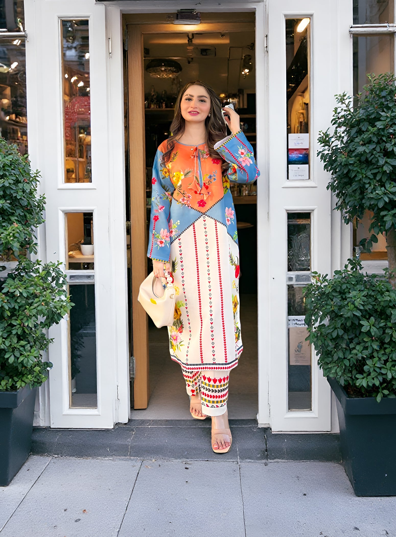 A vibrant fusion of sky blue and tangerine, enriched with delicate floral and foliage motifs. Intricate geometric detailing on the hem elevates this eye-catching look, paired with matching printed pants for a striking summer statement.